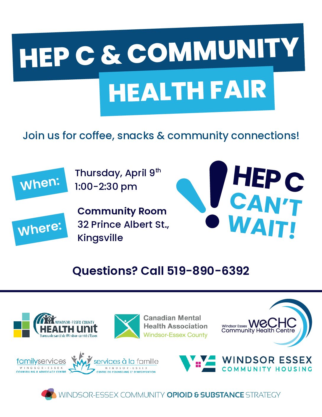 Date Apr 09 2026 Expired! Time 1:00 pm - 2:30 pm Hep C & Community Health Fair Join us for coffee, snacks & community connections ! đź—“ Time: 1:00 PM – 2:30 PM 📍 Location: 32 Prince Albert St. S – Kingsville Share this event + Add to Google Calendar + iCal / Outlook export The event is finished.